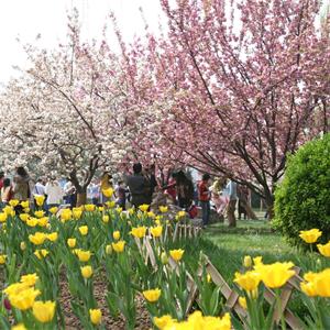 樱缤之路:1994年从樱花园移栽的6株关山和普贤象,因该区域小环境优越,长势旺盛。阳春4月,她们在朝辉和夕阳里倚墙怒放,形成了公园东部灿烂一景。近年来这里又陆续补植了松月、染井吉野等品种,使得赏樱时间提前到了3月下旬。  详情>>